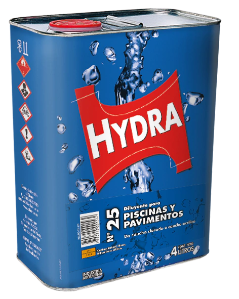 Hydra Piscinas y Pavimento es un diluyente especialmente formulado para disolver productos en base a caucho acrílico o caucho clorado empleado en pinturas para piscinas o demarcación vial. Su alto poder de solvencia logra acabados de gran nivelación en un adecuado balance que permite obtener la mejor calidad en las aplicaciones y la mayor performance. También en líneas industriales de fondos y pinturas de base caucho.